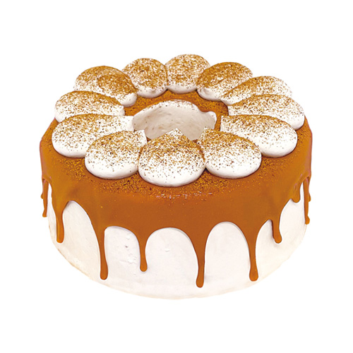 たっぷり絞ったクリームとパリッと食感の濃厚なキャラメルソースの合わさったしっとりの生地のシフォンケーキ。