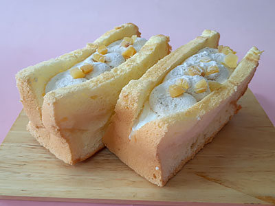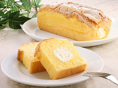 パウンド型で焼き上げたシフォンケーキにクリームを詰めました。