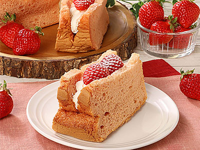 ほわほわのイチゴシフォンケーキに、口どけの良いクリームを挟み、季節限定でイチゴをトッピングしました。