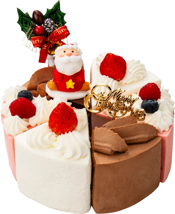 ショートケーキ、チョコレートケーキ、チーズケーキの定番スイーツ3種が一度に楽しめる欲張りなXmasケーキ。スイーツ好きの夢のコラボをクリスマスに実現!