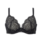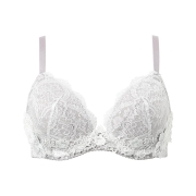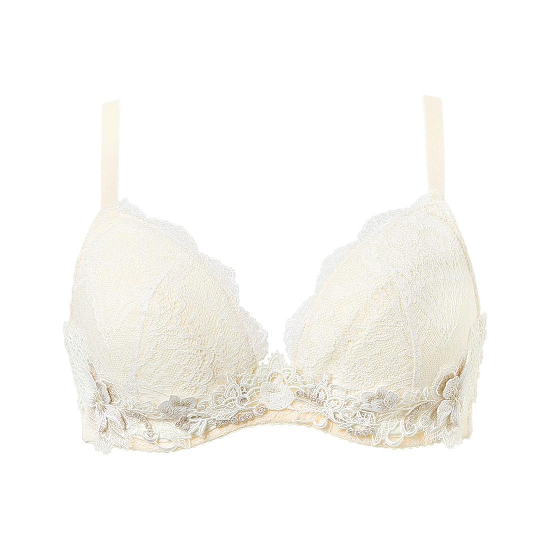●ヨーロッパの宮殿のバルコニーやドームのアーチを連想させる柄の編みレースの上に、宮殿の装飾のようなクラシカルで繊細な幾何学模様調のモチーフをケミカルアップリケで表現し、大切なバストをそっと包みこむように上品にあしらったデザイン