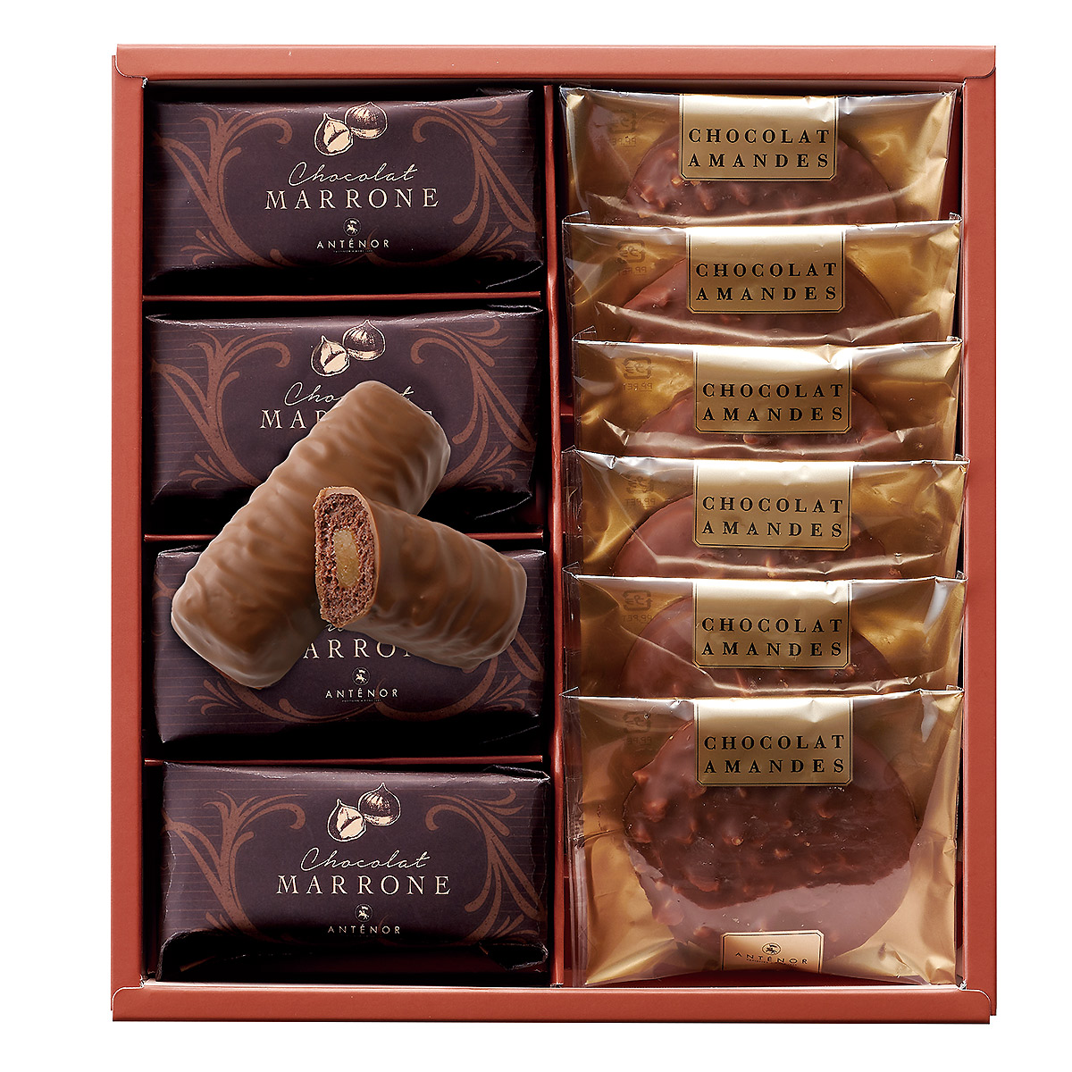 ●内容:ショコラ・アマンド 6個、ショコラ・マローネ 4個、計 10個●箱サイズ:W20.0×L22.0×H5.2cm●商品に含まれるアレルギー特定原材料8品目:小麦、卵、乳成分●アルコール使用:あり●賞味期限:60日>>アンテノール 商品一覧