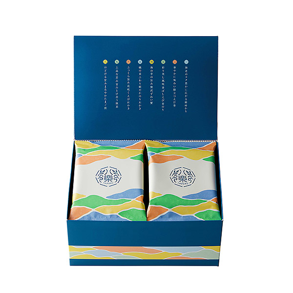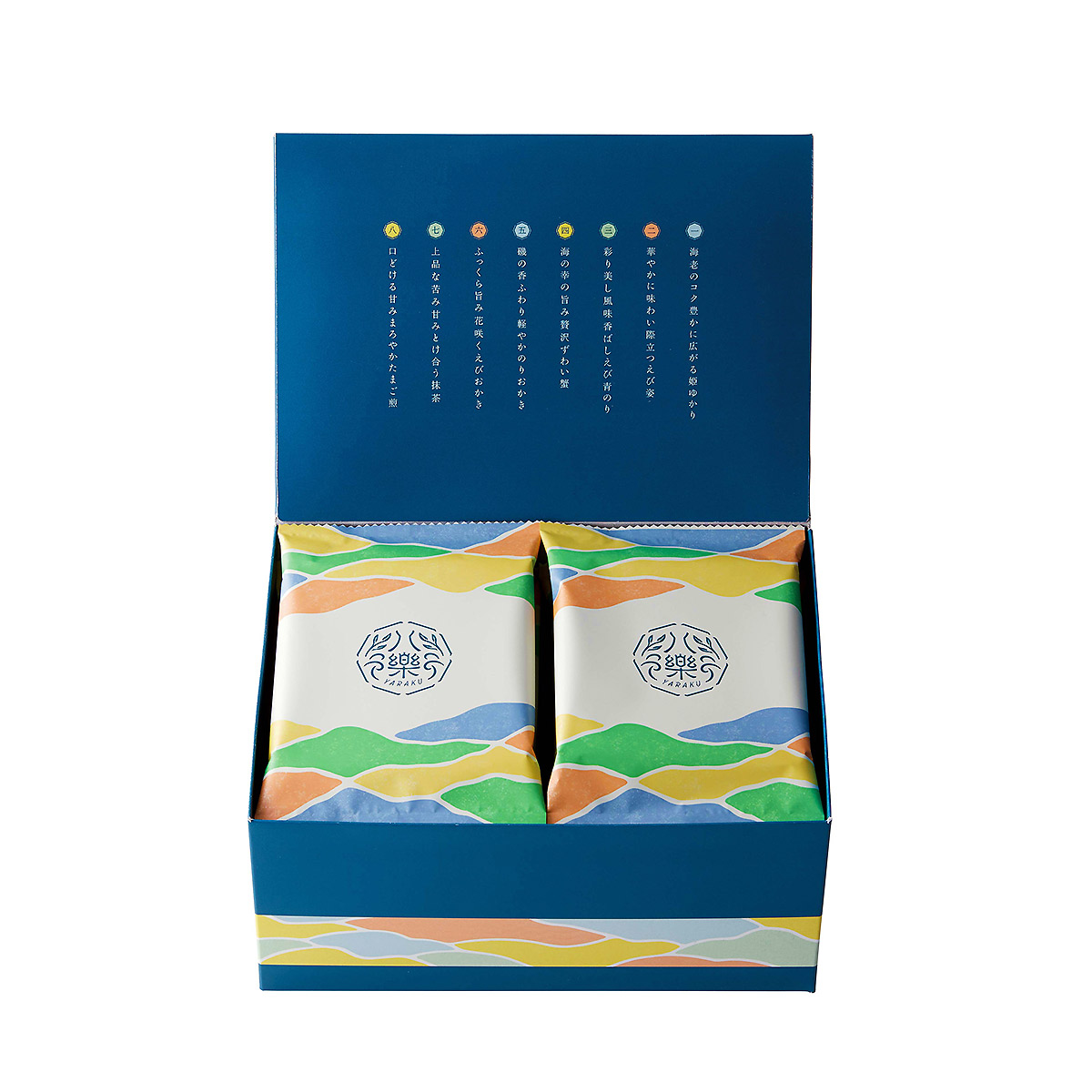 海の幸、山里の幸が活きた豊かな風味と香りを一袋に。彩りも楽しい八種の美味が集います。(姫ゆかり、のりおかき、えび姿、えび青のり、ずわい蟹、えびおかき、抹茶、たまご煎)