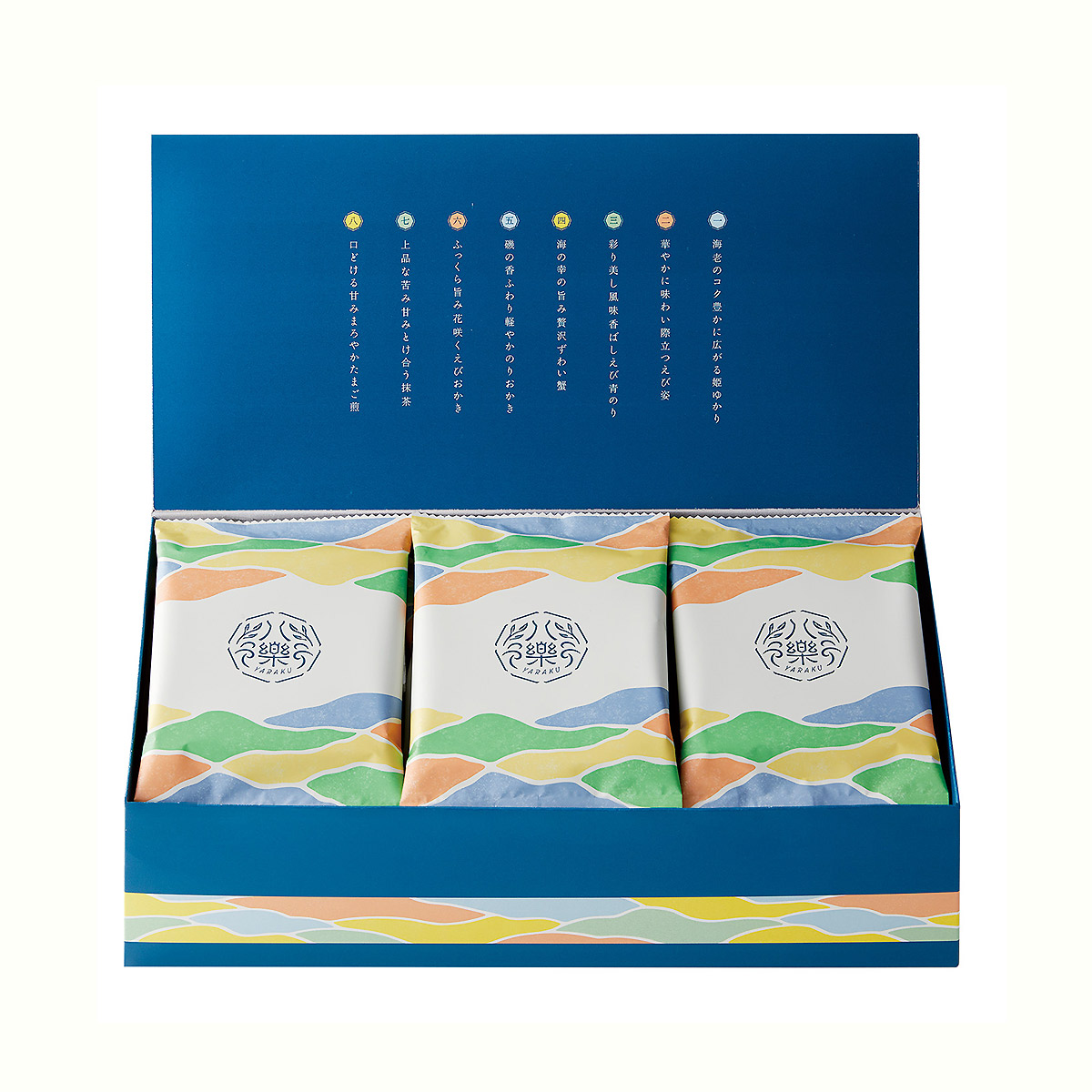 海の幸、山里の幸が活きた豊かな風味と香りを一袋に。彩りも楽しい八種の美味が集います。(姫ゆかり、のりおかき、えび姿、えび青のり、ずわい蟹、えびおかき、抹茶、たまご煎)
