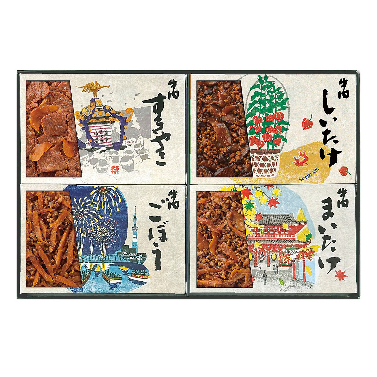 ◎渋谷 東急フードショー取扱商品それぞれの佃煮小箱には、浅草の歳時記が描かれております。浅草の風情を大切な方への贈り物に。
