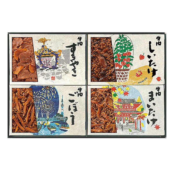 ●詰合せ内容:牛肉すきやき55g、牛肉ごぼう55g、牛肉まいたけ55g、牛肉しいたけ55g●箱サイズ:19×29×2.5cm●商品に含まれるアレルギー特定原材料8品目:小麦●アルコール使用:なし●賞味期限:9か月>>浅草今半 商品一覧