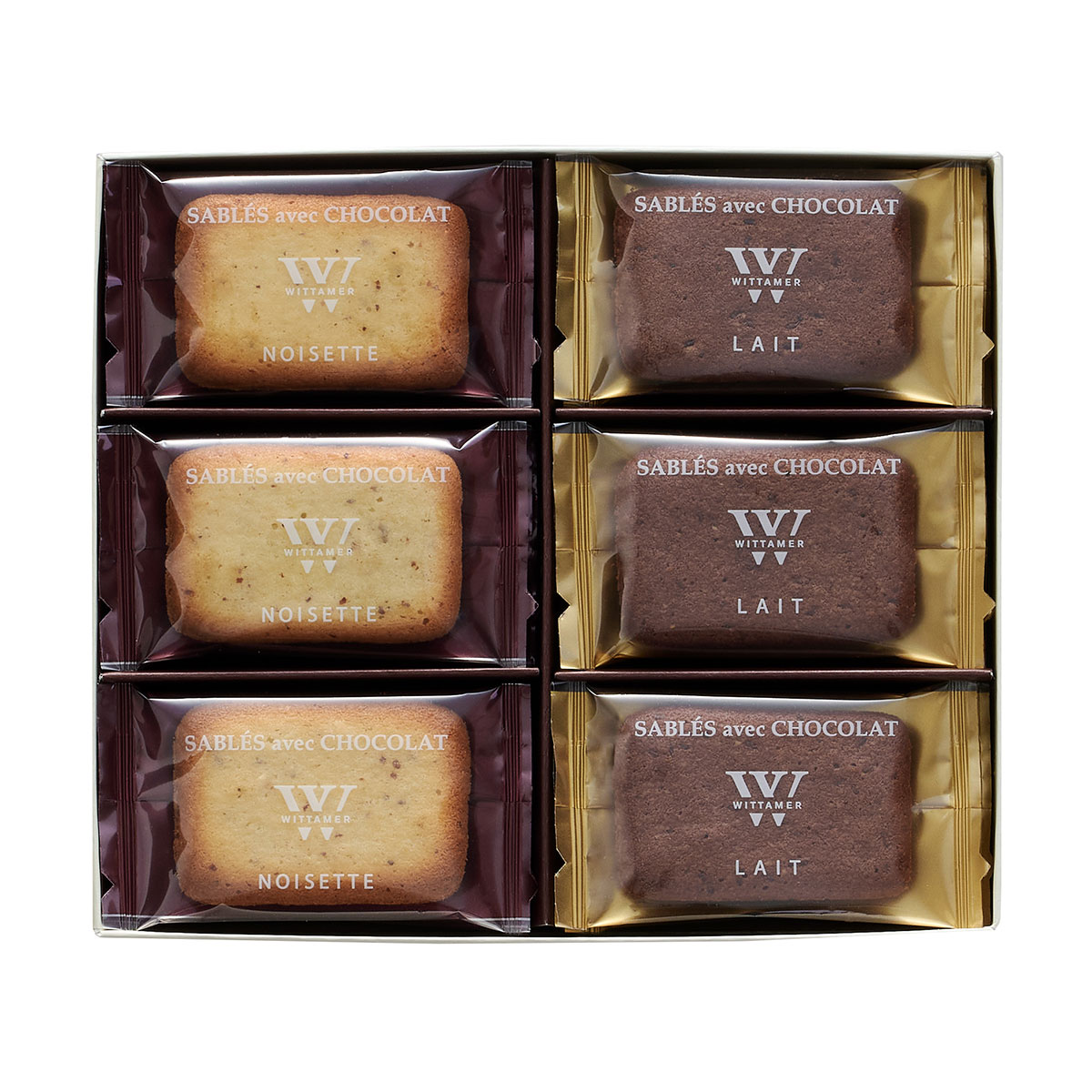 軽やかな食感に焼き上げたサブレにチョコレートをサンドした2種類のサブレ。まろやかなミルクチョコレートと香ばしいヘーゼルナッツの美味しさをサクサクのサブレで挟んでとじこめた、軽やかで気品ある味わいに仕上げました。