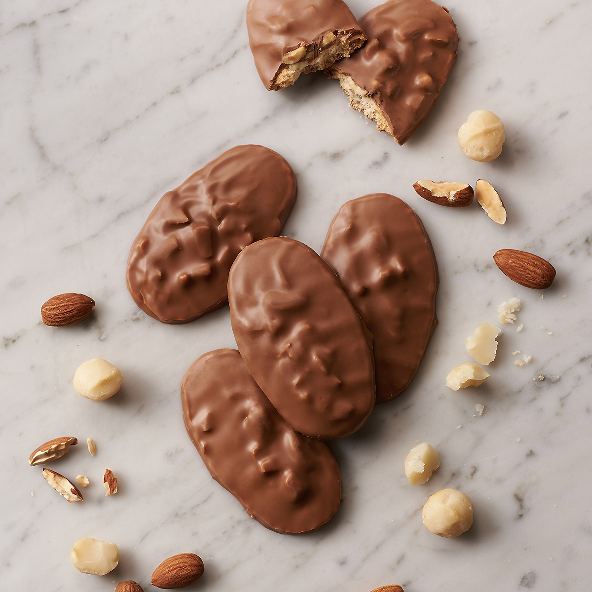 サクサクの食感に焼き上げたサブレに、マカダミアナッツ、アーモンドをのせ、クーベルチュールのミルクチョコレートでコーティングしました。お口の中でほろりと崩れるサブレと、まろやかなミルクチョコレートの魔法のハーモニー。