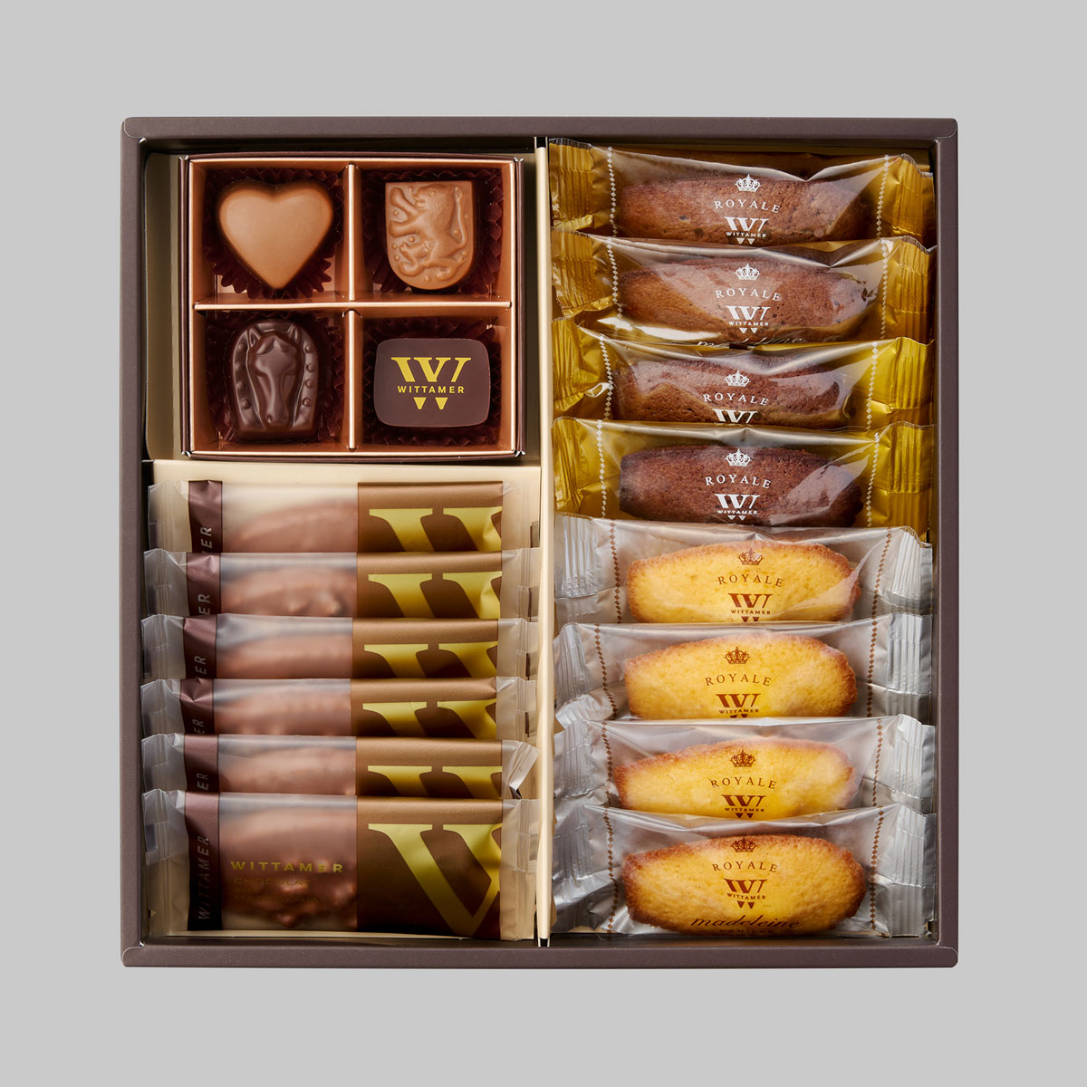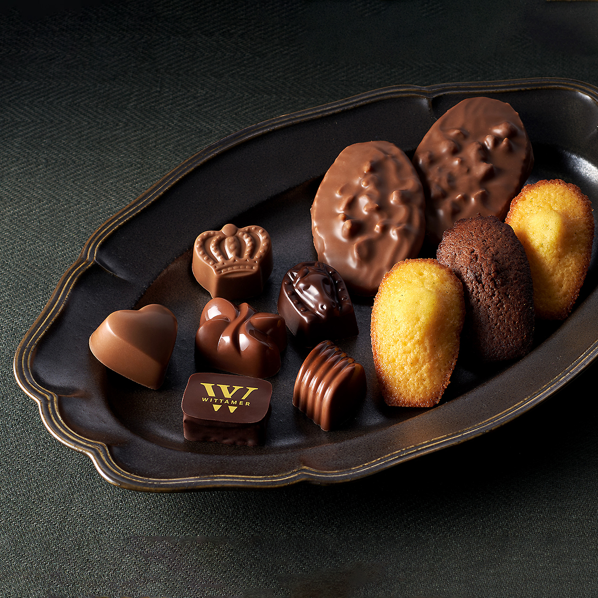 ヴィタメール人気の「マカダミア・ショコラ」やふんわりと焼き上げた「ロイヤル・マドレーヌ」に、まろやかなガナッシュや香ばしいジャンドイヤを包み込んだ艶やかなショコラ。ヴィタメール自慢のお菓子を詰め合わせました。