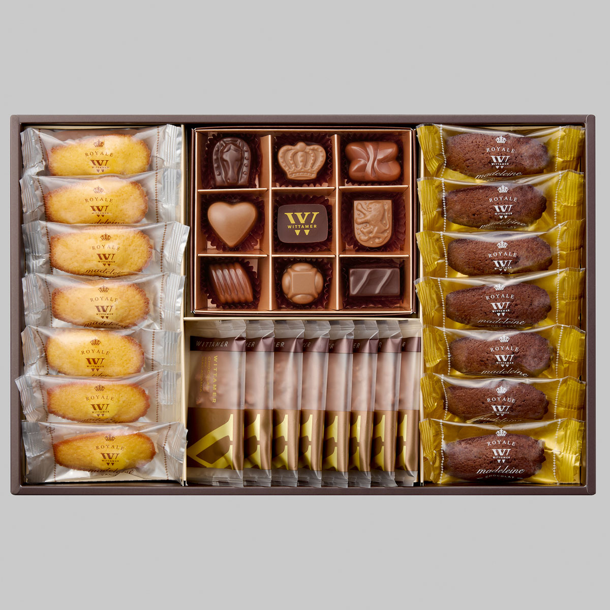 ●内容:マカダミア・ショコラ(ミルク)×8、ロイヤル・マドレーヌ(バニラ、ショコラ各7)、シュバル、クロンヌ、ラムレザン、クール・レ、ヴィタメール、ベルジックカフェ、アンブル、ジュエル、ダンドミディ●箱サイズ:38.8×25.0×5.0cm●商品に含まれるアレルギー特定原材料8品目:小麦、卵、乳成分●アルコール使用:あり●賞味期限:製造日から42日>>ヴィタメール 商品一覧