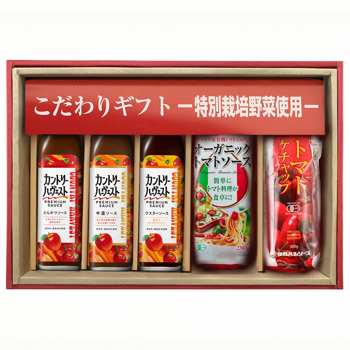 ●内容:カントリーハーヴェストとんかつソース(300ml)、カントリーハーヴェスト中濃ソース(300ml)、カントリーハーヴェストウスターソース(300ml)、オーガニックトマトソース(280g)、オーガニックトマトケチャップ(500g)●箱サイズ:25.7×39.7×7.0cm●商品に含まれるアレルギー特定原材料8品目:小麦●アルコール使用:なし●賞味期限:製造日から18ヶ月※お届けまでに1週間前後のお日にちを頂戴いたします。※こちらの商品は、沖縄・離島へのお届けは承れません。