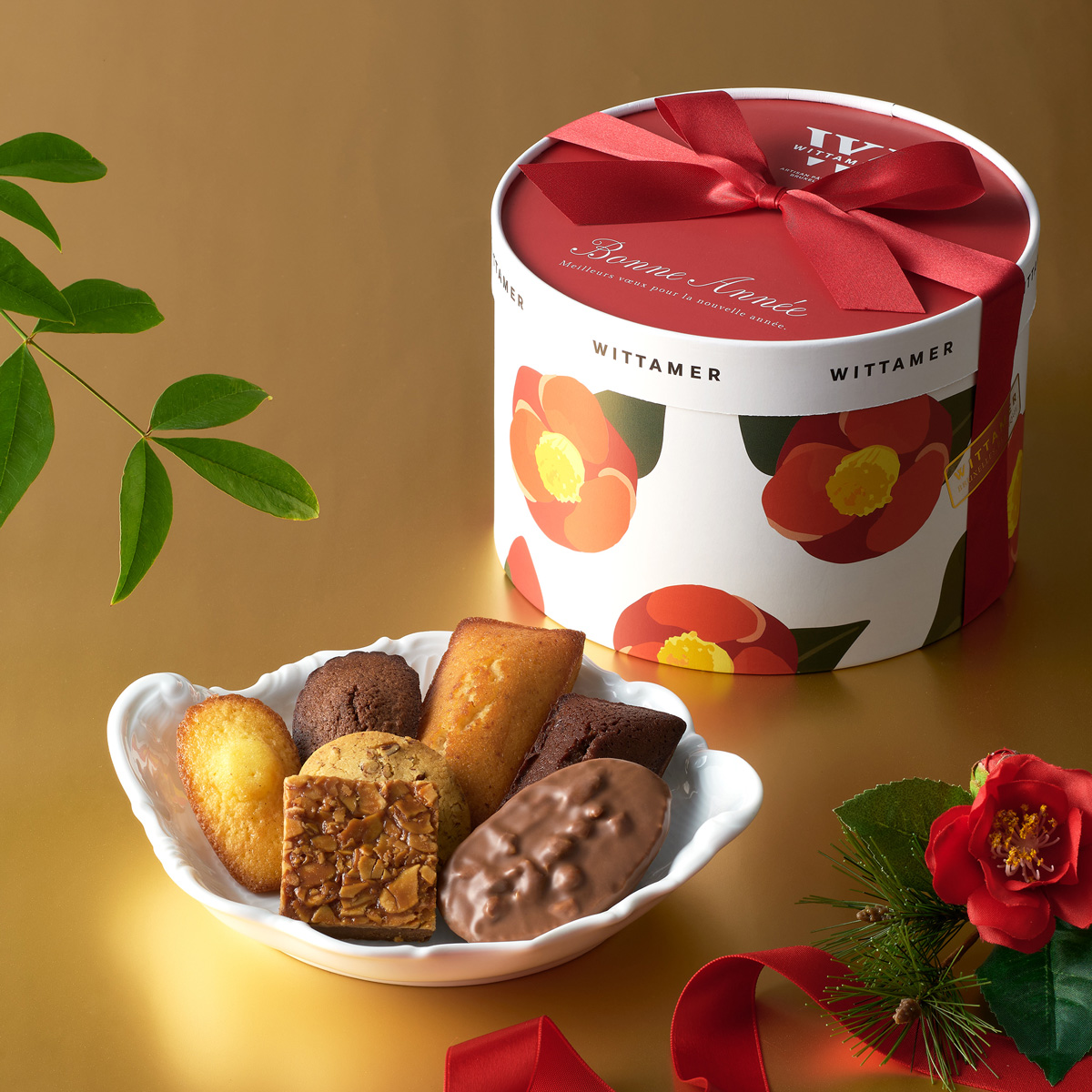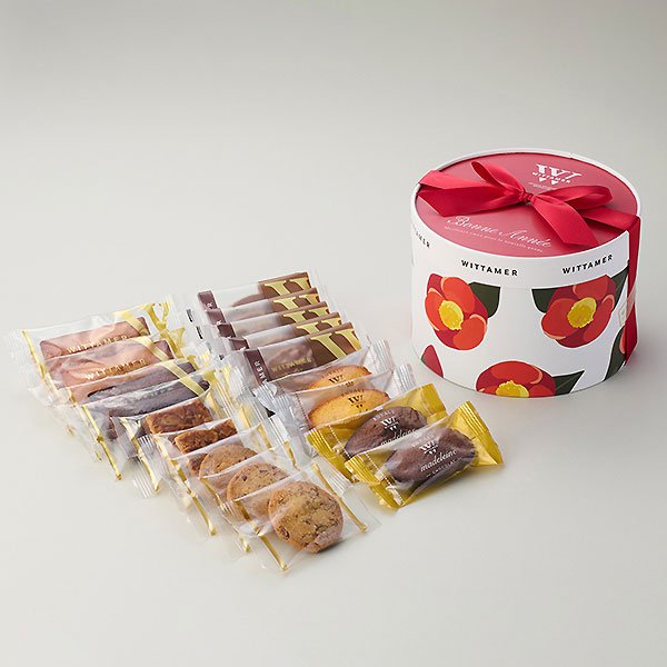 ◎渋谷 東急フードショー取扱商品椿をあしらった丸い限定BOXに、人気のマカダミア・ショコラやフィナンシェなど風味豊かな焼き菓子を詰め合わせました。お年賀におすすめです。