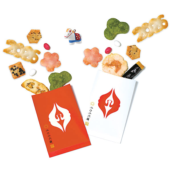 ◎渋谷 東急フードショー取扱商品紅白に二羽の鶴の文様がおめでたい「二〇二六餅」。年号をかたどったおかきや吉祥を象徴する松に梅、縁起の良い米菓が勢ぞろいのお年賀限定商品です。手作業で描いた干支の「午」の人形が一箱にひとつ必ずついています。