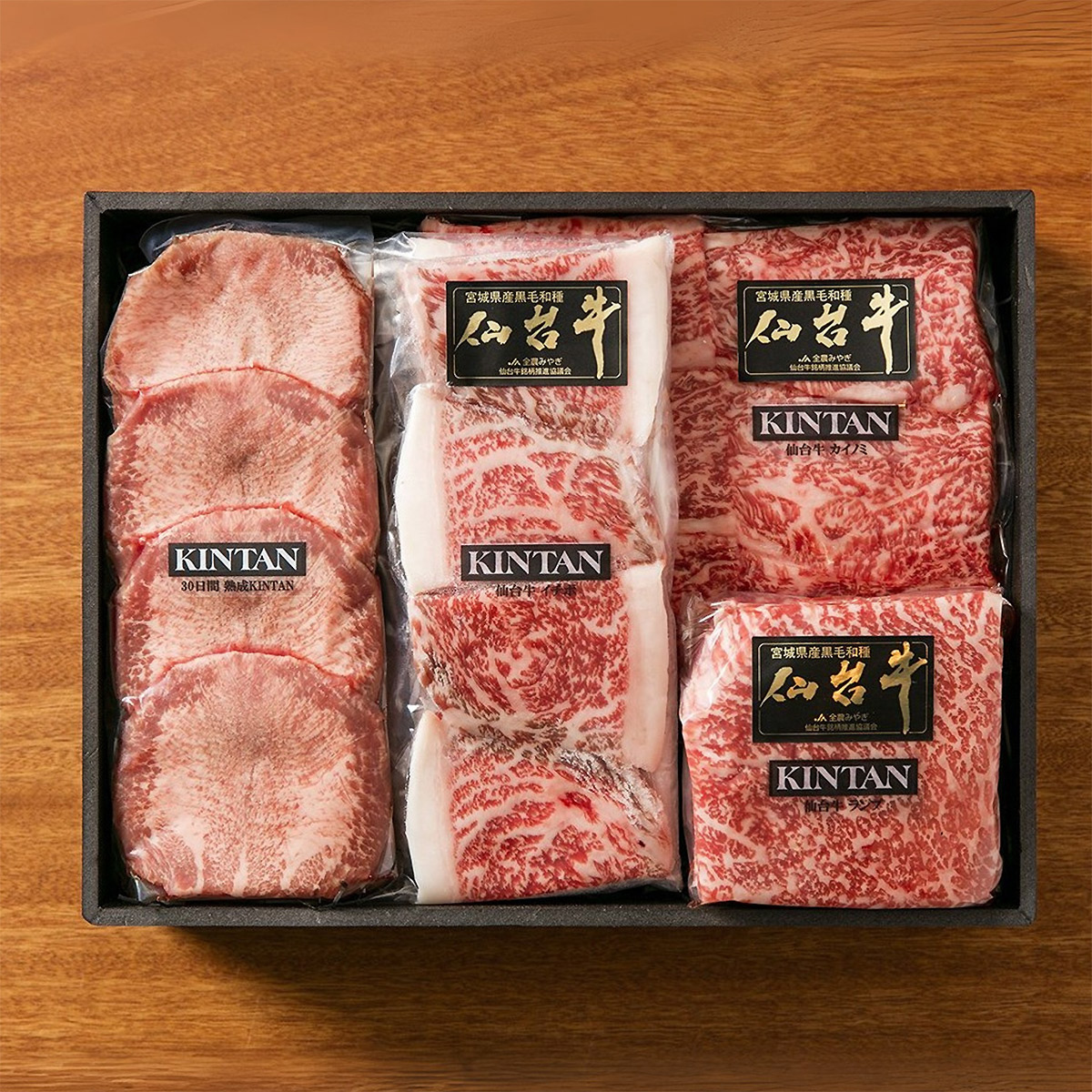仙台牛は全国で唯一、肉質等級が「5」に格付けされないと呼称が許されないブランド和牛です。 名物の『30日間熟成タン』と仙台牛『上カルビ』、仙台牛『ランプ』、仙台牛『イチボ』の4種類入り。冷凍しない生の状態で、美味しさをそのままお届けします。セットには、ごはんにもお肉にもよく合う『KINTAN焼肉のタレ』と焼肉のおともにピッタリな『特製キムチ』、『韓国海苔』、締めの『冷麺セット』も含まれるので、届いた商品だけで、お店と変わらない本格的な味わいを自宅で楽しめます。上質なブランド和牛の仙台牛焼肉セットは、大切な方へのプレゼントやグルメな方への贈り物、家族や友人との思い出をつくる特別なホームパーティーにぴったりです!