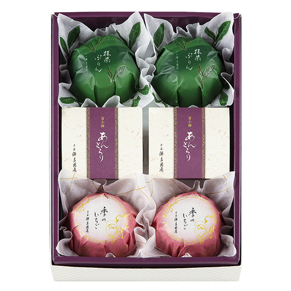 もっちりとした小餅となめらかに仕上げたあんを合わせた【あんとろり】、甘酸っぱいいちごソースとやさしい甘さのムースを合わせた【季のいちご】、かのこ豆をちりばめた抹茶の香り豊かな【抹茶ぷりん】、季節の和菓子を詰め合わせました。こちらの商品は無くなり次第終了となります。