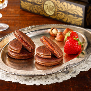 ◎渋谷 東急フードショー限定品風味豊かな2種類のソースをミルクチョコレートでコーティングし、さっくりと焼き上げたココアクッキーでサンドした、贅沢な味わいのショコラサンドです。濃厚なヘーゼルナッツクリームと、爽やかな酸味のストロベリーソースの2つの味を渋谷限定のパッケージに詰め合わせました。
