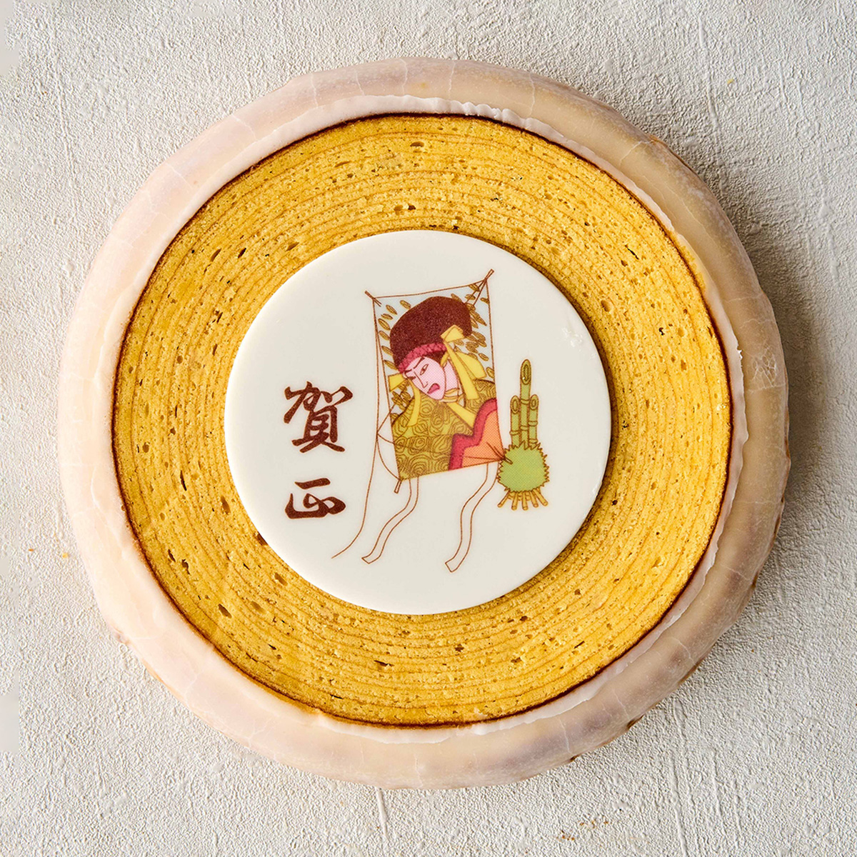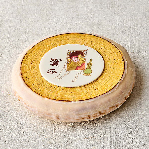 ◎二子玉川 東急フードショー取扱商品ヴィヨン定番のプレーンバウムクーヘンに賀正のプレートを付けた新春のご挨拶にふさわしいお品物です。
