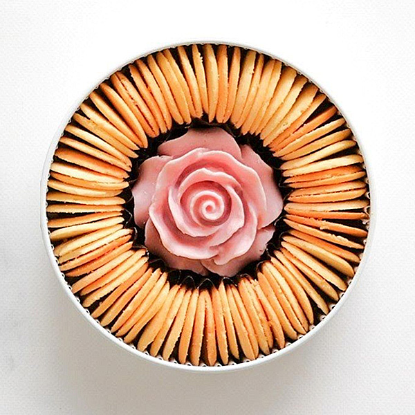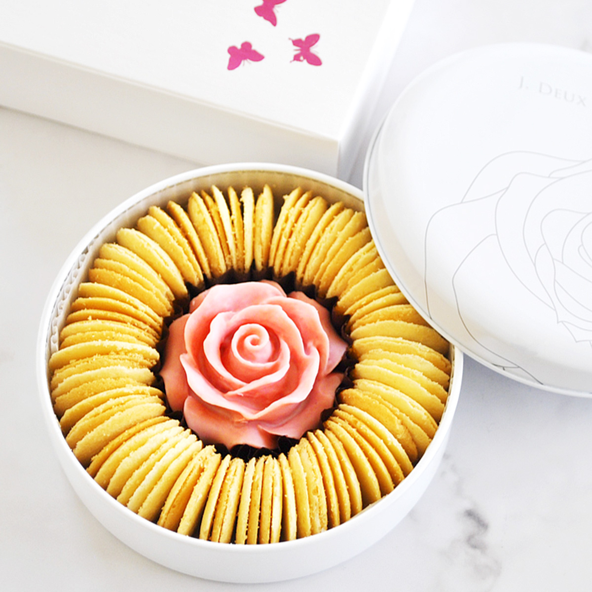 ラングドシャは北海道産の生クリームを使用し、ミルキーで口の中で溶けるやさしい食感に仕上げ、フランス産のチョコを使用した美しいバラの花で飾りました。
