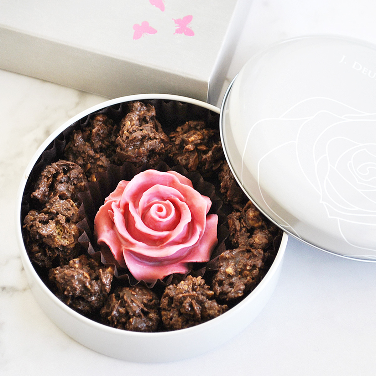●内容:チョコクランチ45g、ローズチョコ1個、フレーズサブレ1枚●箱サイズ:11.5×11.5×3.5cm●商品に含まれるアレルギー特定原材料8品目:小麦、卵、乳成分●アルコール使用:なし●賞味期限:製造から30日