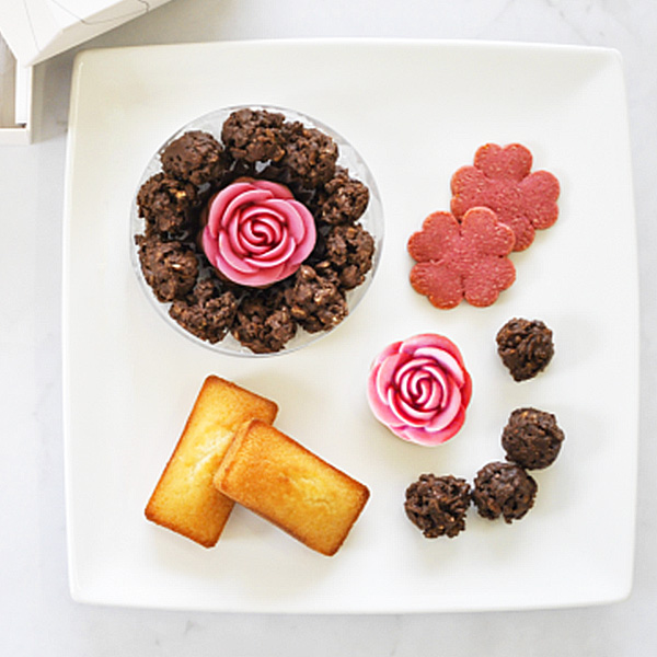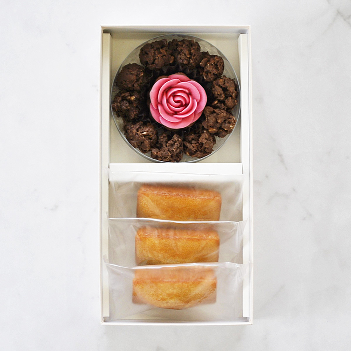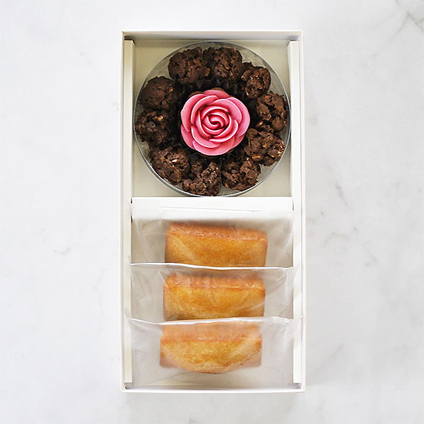 ラングドシャを使用した、チョコレートの奥深い甘みとサクサク軽い食感が特徴のクランチローズチョコに、焦がしバターを使用したしっとり食感のフィナンシェの詰め合わせ。