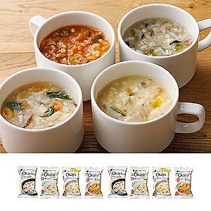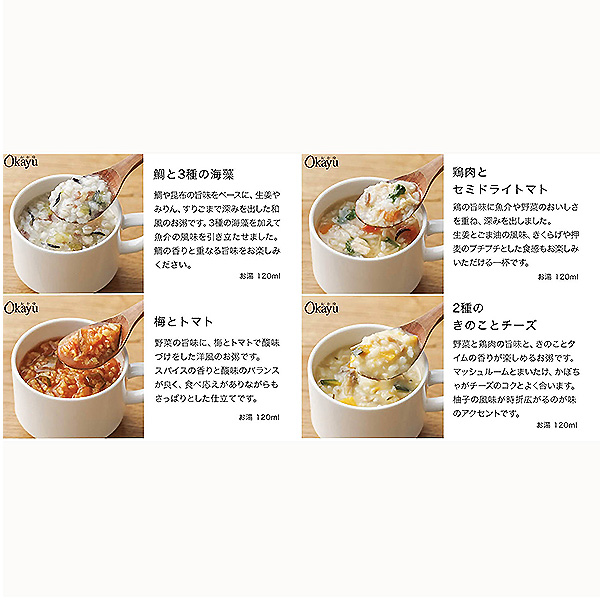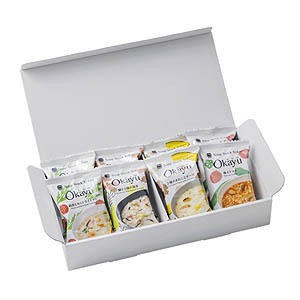 Okayu(おかゆ)4種類を2個ずつ、白いギフト箱に入れてお届けします。