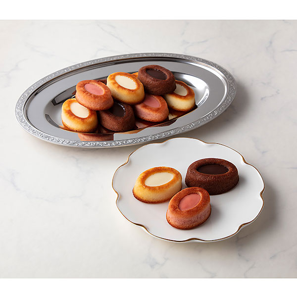 ◎たまプラーザ店取扱商品自家製ヨーグルト入りのフィナンシェ生地に、チョコクリームを流し込みました。プレーンはプレーン生地のフィナンシェにヨーグルトチョコクリーム。ショコラはココア生地のフィナンシェにダークチョコレートムース。いちごはいちご生地のフィナンシェにいちごチョコクリームをトッピングしております。ほんのり爽やかな味わいが広がる、しっとりやわらかな一品をお楽しみください。