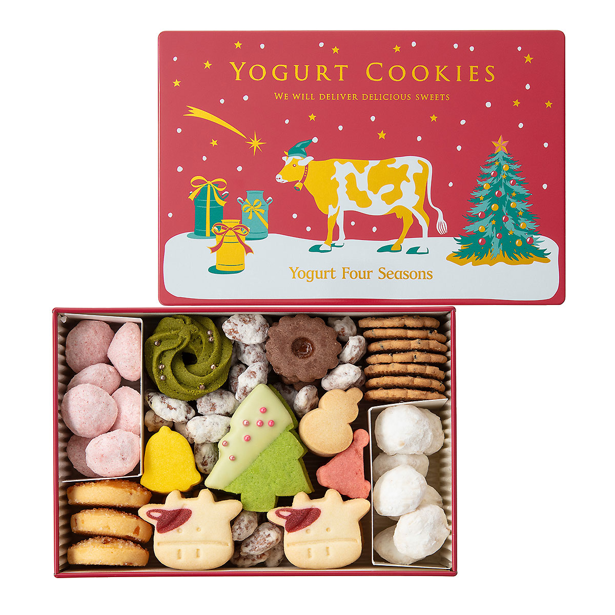 ◎たまプラーザ店取扱商品洋菓子一番人気のヨーグルトクッキー缶から今年もクリスマス缶が発売されます。前回までは蓋のみのデザインでしたが今回は缶全体にデザインを施しており、より一層可愛らしいクッキー缶となっています。中身もクリスマスツリーやサンタ帽などクリスマスにちなんだクッキーがあります。ご家族や友人など大切な方へのクリスマスプレゼントにいかがでしょうか。