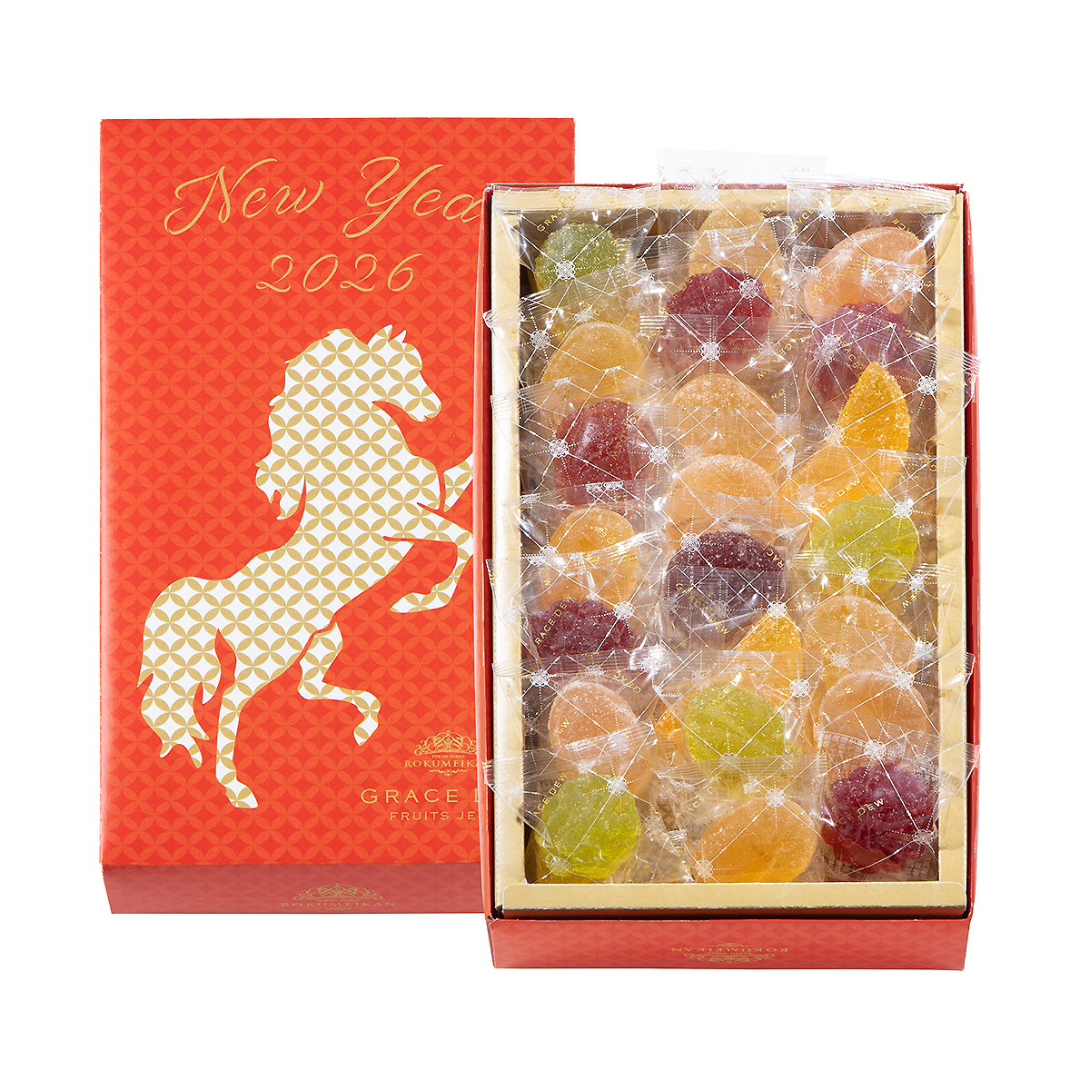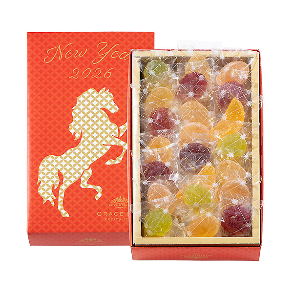 鹿鳴館の代表菓、果実生まれのペクチンゼリー。果実の豊潤な味わい・彩りを、宝石のような一粒にとじ込めて。独特の食感を食べやすいひとくちサイズに。迎春限定パッケージ。