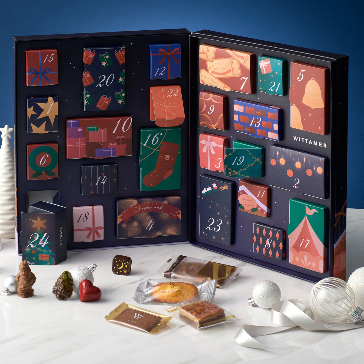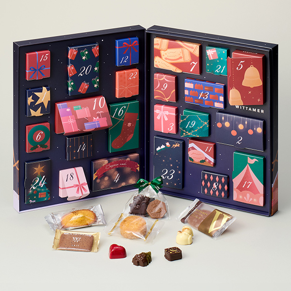 ●内容:サパン・ド・ノエル(ビターガナッシュ)×1、スノーマン(キャラメルクリーム)×1、サンタ(ミルクチョコガナッシュ)×1、ツリー(ピスタチオ)×1、ツリー(フレーズ)×1、ヴィタメール×1、クール・レ×1、アンブル×1、クール・フランボワーズ×1、シトロン・ヴェール×1、シュバル×1、ラムレザン×1、トリュフ・レ×1、トリュフ・ブラン×1、プティ・ノエル×2、マカダミア・ショコラ(ミルク)×1、マカダミア・ショコラ(ダーク)×1、ロイヤル・マドレーヌ(バニラ)×1、ロイヤル・マドレーヌ(ショコラ)×1、サブレ・ショコラ(ミルク)×1、サブレ・ショコラ(ノワゼット)×1、ガレット×1、フロランタン・ショコラ×1、ダックワーズ・ショコラ×1