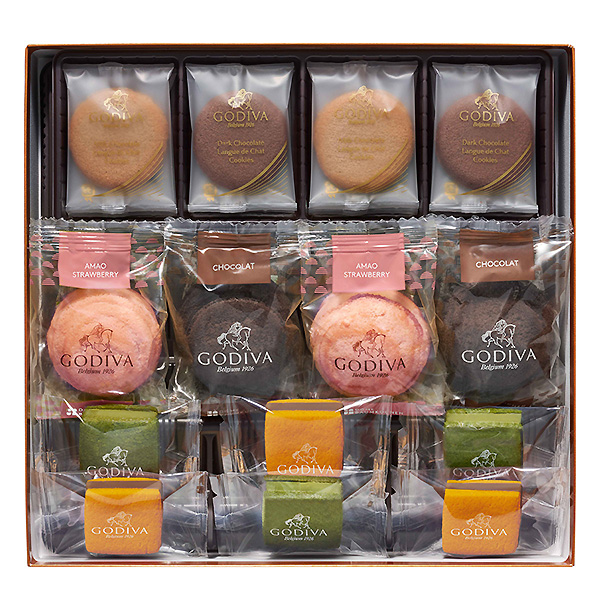 ゴディバで人気の焼き菓子「サブレショコラ」「ラングドシャクッキー」「ドームバームクーヘン」の3種を色とりどりにアソートしました。定番フレーバーと期間限定フレーバーいずれも楽しんでいただけるアソートメントです。