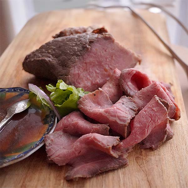 牛もも肉をじっくり低温で調理したジューシーで柔らかなローストビーフです。