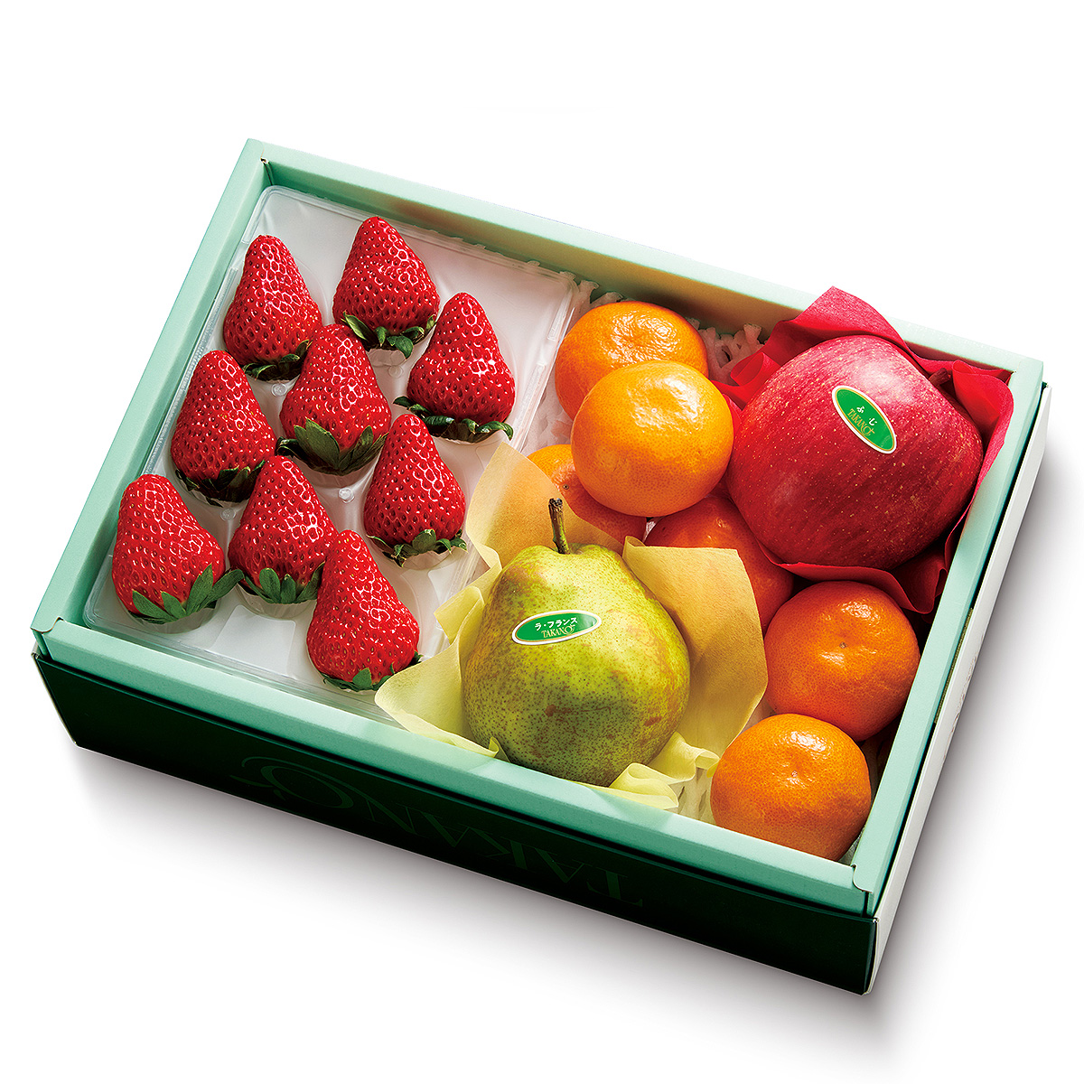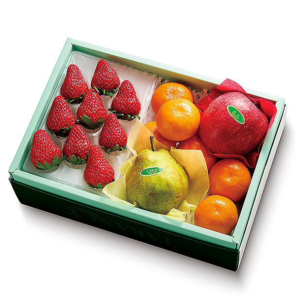 ●内容:苺9粒(静岡県、佐賀県、栃木県、熊本県、千葉県、長崎県、茨城県または福岡県産)、ふじ(青森県、山形県、長野県または岩手県産)、ラ・フランス(山形県産)×各1、みかん(愛媛県、和歌山県、熊本県または長崎県産)×6