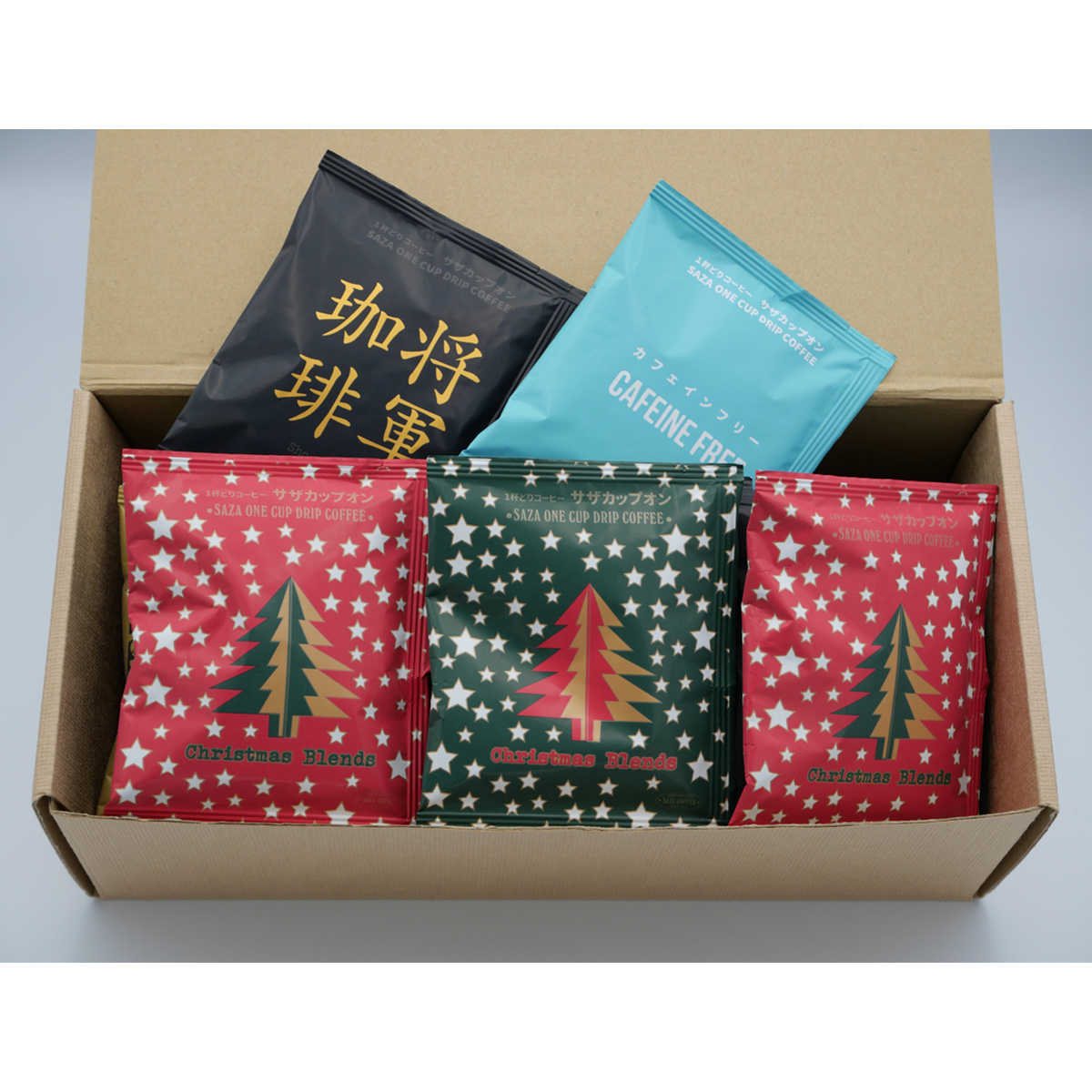 ●内容:クリスマスブレンド赤 カップオン10枚、クリスマスブレンド緑 カップオン5枚、将軍珈琲 カップオン5枚、カフェインフリー カップオン5枚