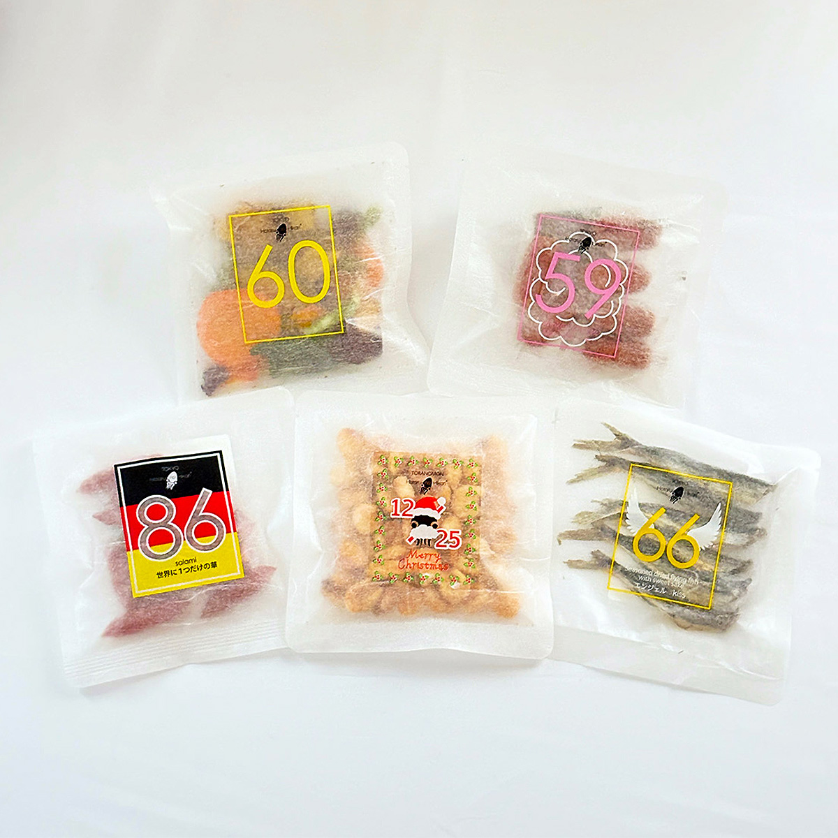●内容:No.12/25 Merry Christmas(梅昆布味ジャイアントコーン)、No.59 Mo-Mo-モー(スモークチーズ)、No.60 イザナミの舞(野菜チップス)、No.66 エンジェルkiss(あごみりん干し)、No.86 世界に1つだけの華(サラミソーセージ)各1個、ブランド手提げ付き