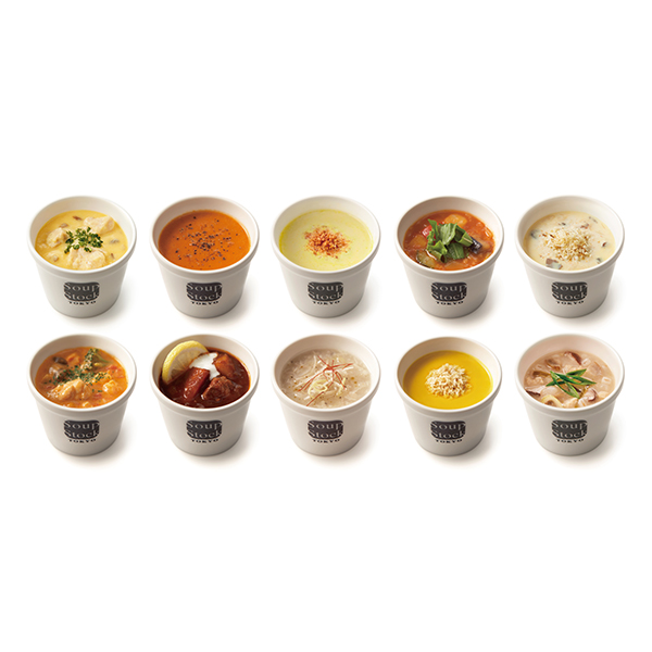 北海道産とうもろこしと鶏肉のシチュー×1、オマール海老のビスク×1、とうもろこしとさつま芋のスープ×1、トマトと鶏肉のシチュー×1、東京ボルシチ×1、東京参鶏湯×1、ミネストローネ×1、北海道産かぼちゃのスープ×1、オニオンクリームポタージュ×1、焼き鯛だしの和風スープ×1