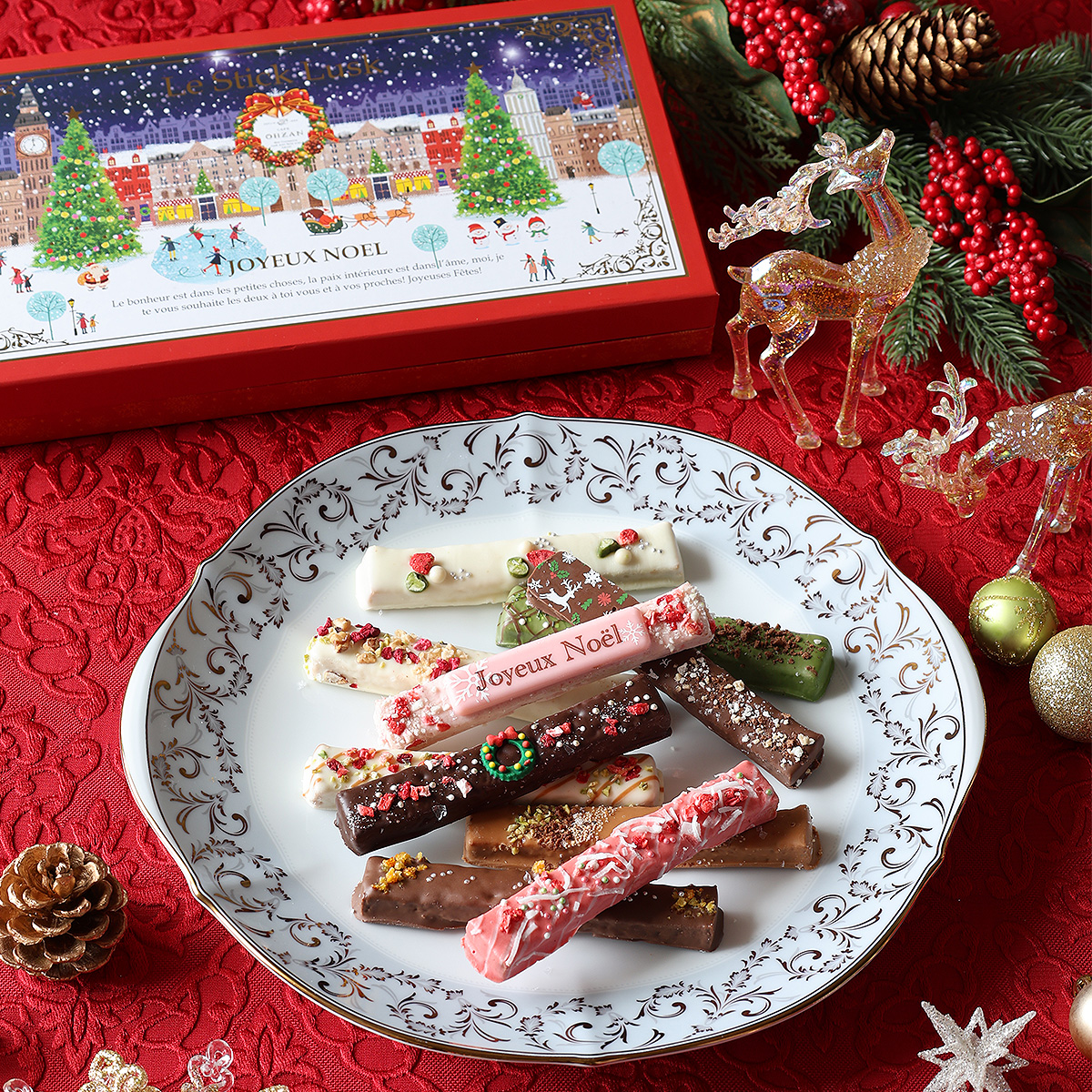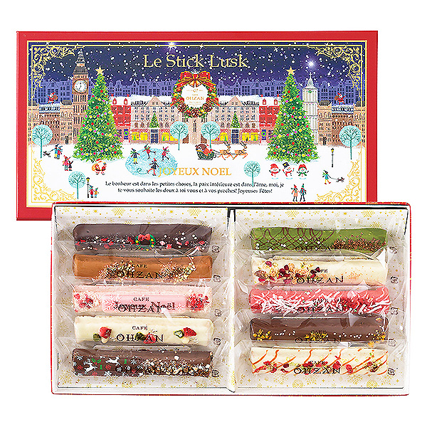 “大人可愛い”ד楽しい” CAFE OHZANのクリスマスの世界Xmasスティックラスクのパッケージデザインではヨーロッパの街並みをohzan風にイメージしました。ラスクにはフランス語でメリークリスマスを意味する「Joyeux Noel」のプレートやメレンゲでおつくりしたクリスマスリースやトナカイ柄のシートで可愛さを演出しています。贈る人も贈られる人も、楽しくなるohzanのXmasギフト、今年も喜んでいただいて、みんなを笑顔で繋ぎますように・・・>>[クリスマスギフト]洋菓子 商品一覧>>クリスマスギフト 商品一覧