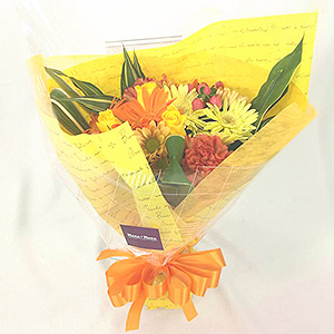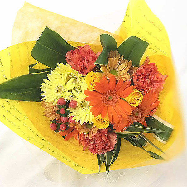 イエローオレンジブーケです。定番の色合いで、どなた様にも贈り物としてお使いいただけるおすすめブーケです。