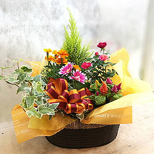 ※デザイナーおまかせ商品ですので、お花の種類、色、形態、キャラクターピック、バスケット(器)、資材は、サンプル画像と異なります。予めご了承ください。