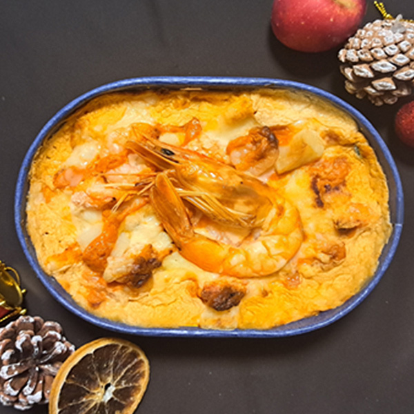 通常の「海老と蟹のグラタン」をクリスマスバージョンに。海老と蟹の他、帆立やアメリケーヌソースもふんだんに使用しました。複雑な味わい、濃厚さのあるとても贅沢なグラタンです。上にはニューカレドニアの海で育った非常に高品質な「天使の海老」を1匹まるごと飾っています。大きめのサイズなのでお二人様でお取り分けにも。