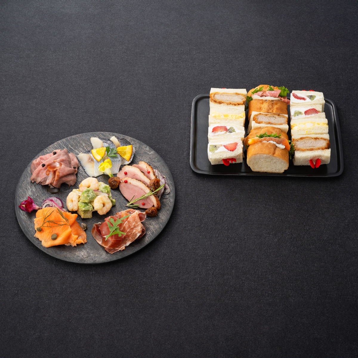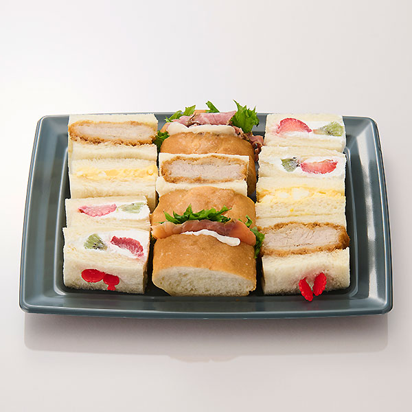 パストラミポークのバケットサンド、クリームチーズ&サーモンサンド、ひとくちタマゴサンド、ひとくちイチゴ&キウイのサンド、ひとくちヒレカツサンド