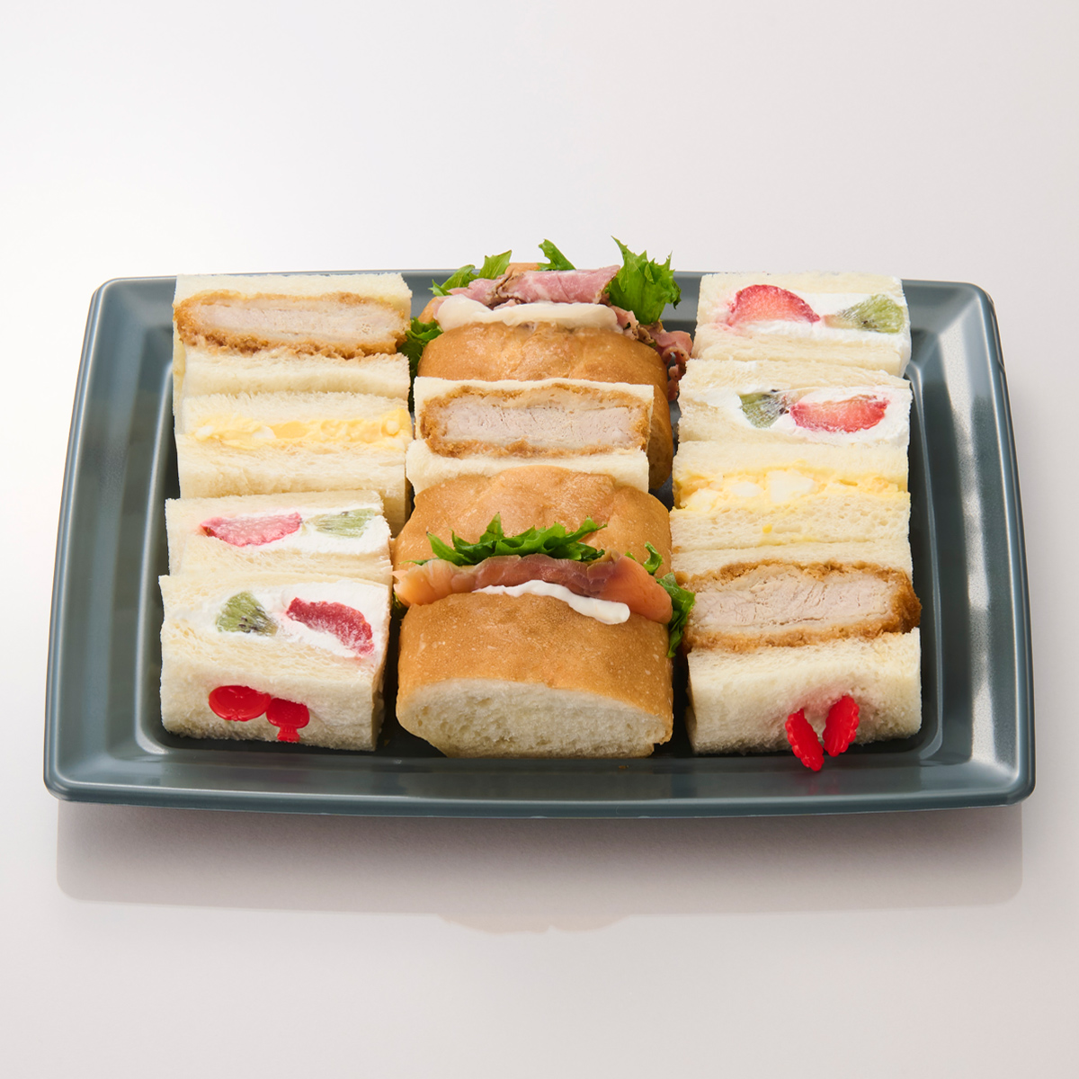 ●内容:パストラミポークのバゲットサンド×1切、クリームチーズ&サーモンのバゲットサンド×1切、タマゴサンド×2切、いちご&キウイのサンド×2切、ヒレカツサンド×3切