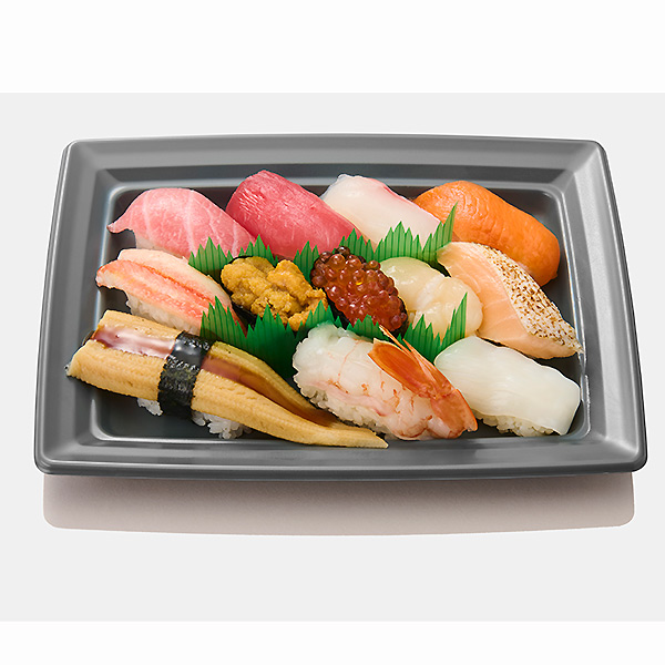 ●内容:本まぐろ中とろ、めばちまぐろ赤身、真鯛、サーモン、ずわいかに、うに、いくら、ほたて、炙りサーモン、穴子、赤えび、いか各1貫