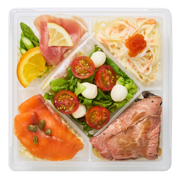 ●内容:トマトとモッツァレラチーズのサラダ(香り高いバジルソース付き)/アスパラとオレンジのクリーミーオレンジソース/生ハムのマリネ/ローストビーフのサラダ/蟹のシーフードパスタサラダ/サーモントラウトとツナポテトのサラダ