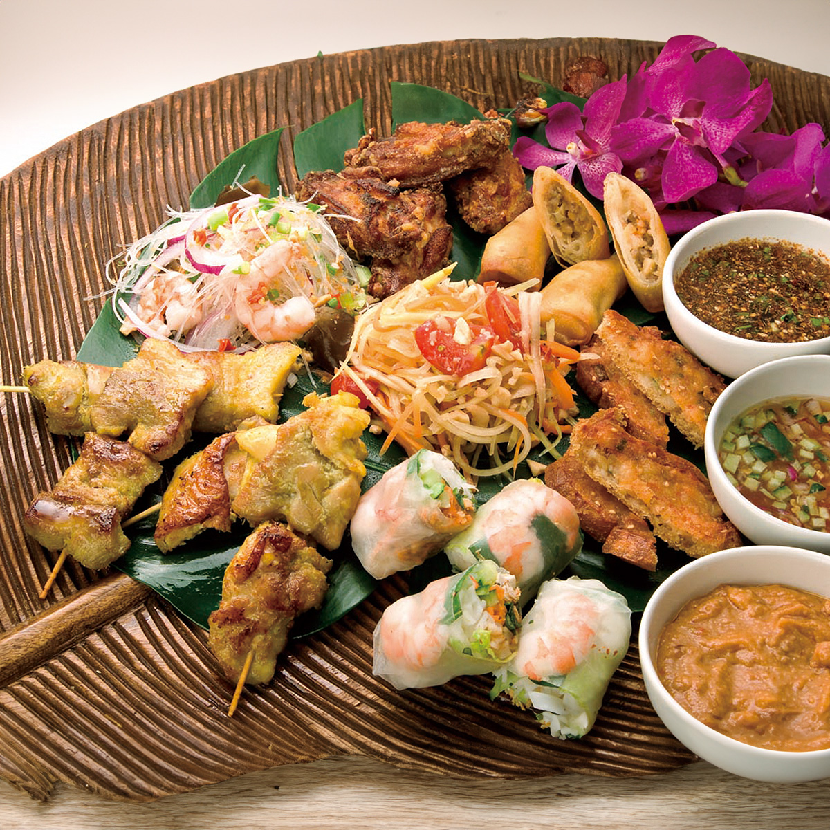 ●内容:7品目の盛り合わせ 生春巻き、ヤムウンセン(春雨サラダ)、ソムタム(青パパイヤのサラダ)、ガイトード(鶏モモ肉の唐揚げ)、サテ(鶏肉と豚肉のBBQ)、カノムパンナークン(海老のすり身トースト)、ポーピアトード(揚げ春巻き)