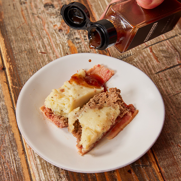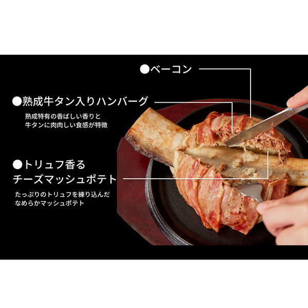 クリスマス、チキンの時代はもうおしまい!全長35cm・1kgの特大サイズの骨付きビーフ。トリュフ入りチーズマッシュポテトが入った牛タンハンバーグをベーコンで包み仕上げました。ハンバーグには熟成牛タンを練り込んでいます。