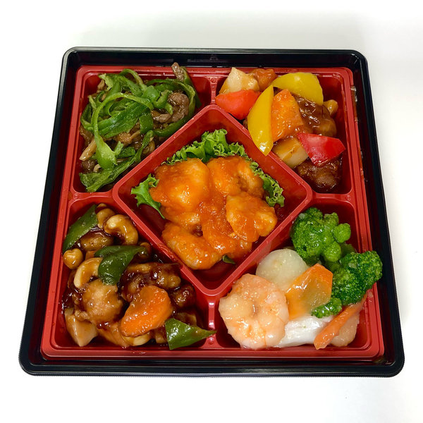 ●内容:牛肉ピーマン細切り炒め、プレミアムもち豚の酢豚、エビチリ、鶏肉カシューナッツ炒め、エビとブロッコリーの塩炒め。