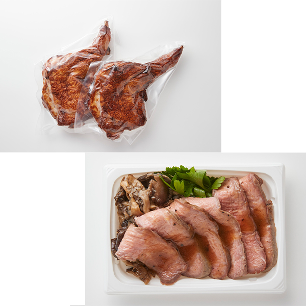 ●内容:桜島どりのもも肉ロースト2個/トリュフ香る牛肉グリル 霜降りひらたけ添え200g/北海道産生ハムとルッコラの華やぎサラダ(シャルドネビネガードレッシング付き)200g/たっぷり海の幸の美味サラダ200g