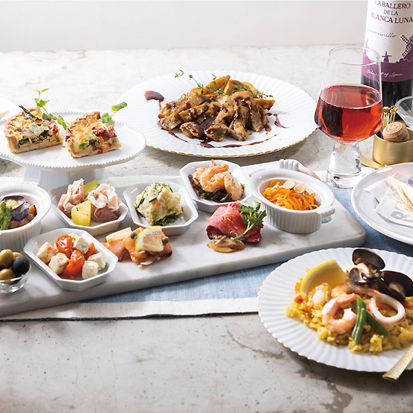 ●内容:「上段」カクテルシュリンプ、キャロットラペ、生ハムメロン添え、スモークサーモン、ローストビーフ、ポテトサラダ、フェタチーズマリネ、彩り野菜のアラビアータ、オリーブ、「下段」キッシュロレーヌ、フライドポテト、パエリア、グリルチキン(バルサミコソース)、専用の保冷バッグ付き