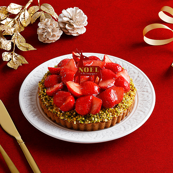 真っ赤な苺を一面に敷き詰めて。コントラストのあるピスタチオの彩りと香ばしさが、クリスマスに映える一品。