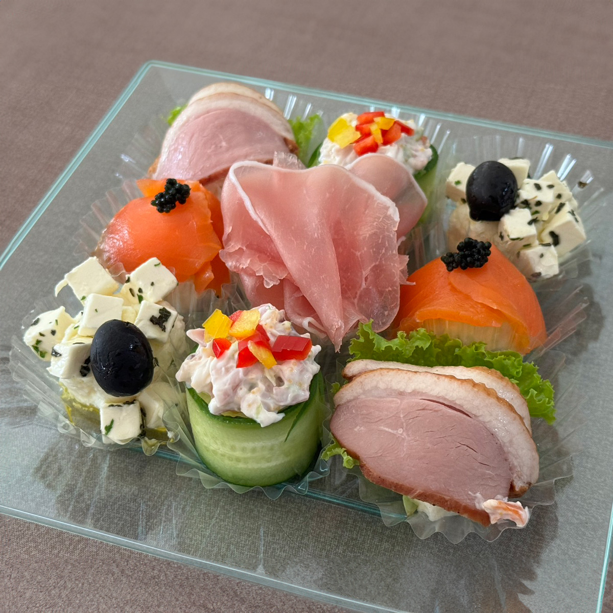 ●内容:[1段目]ローストビーフ、[2段目]ホタテのマリネカップ×2、合鴨スモークカップ×2、海老のタルタルカップ×2、スモークサーモンカップ×2、生ハムカップ×1